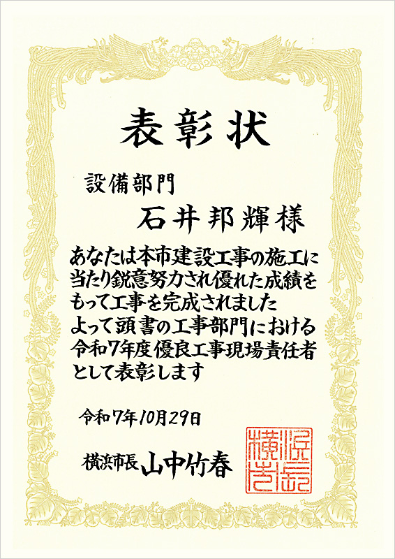2025-10-29 横浜市より令和7年度 優良工事技術者表彰設備部門で 弊社工事部課長 石井 邦輝が表彰されました。