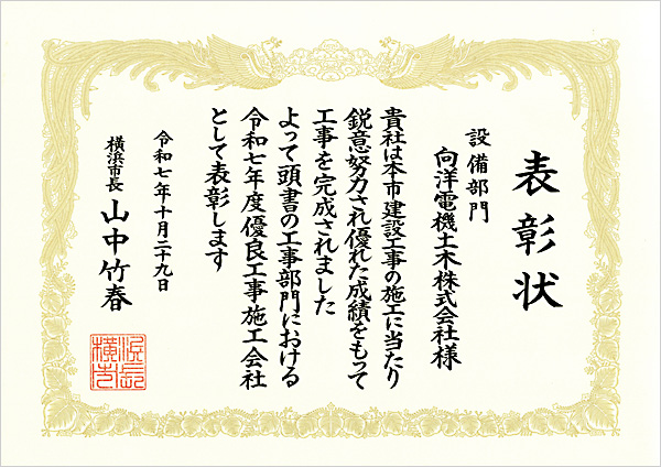 2025-10-29 横浜市より令和7年度 優良工事施工会社設備部門で弊社が表彰されました。
