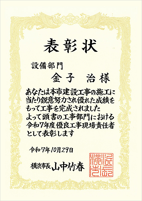2025-10-29 横浜市より令和7年度 優良工事技術者表彰設備部門で 弊社工事部部長 金子 治が表彰されました。